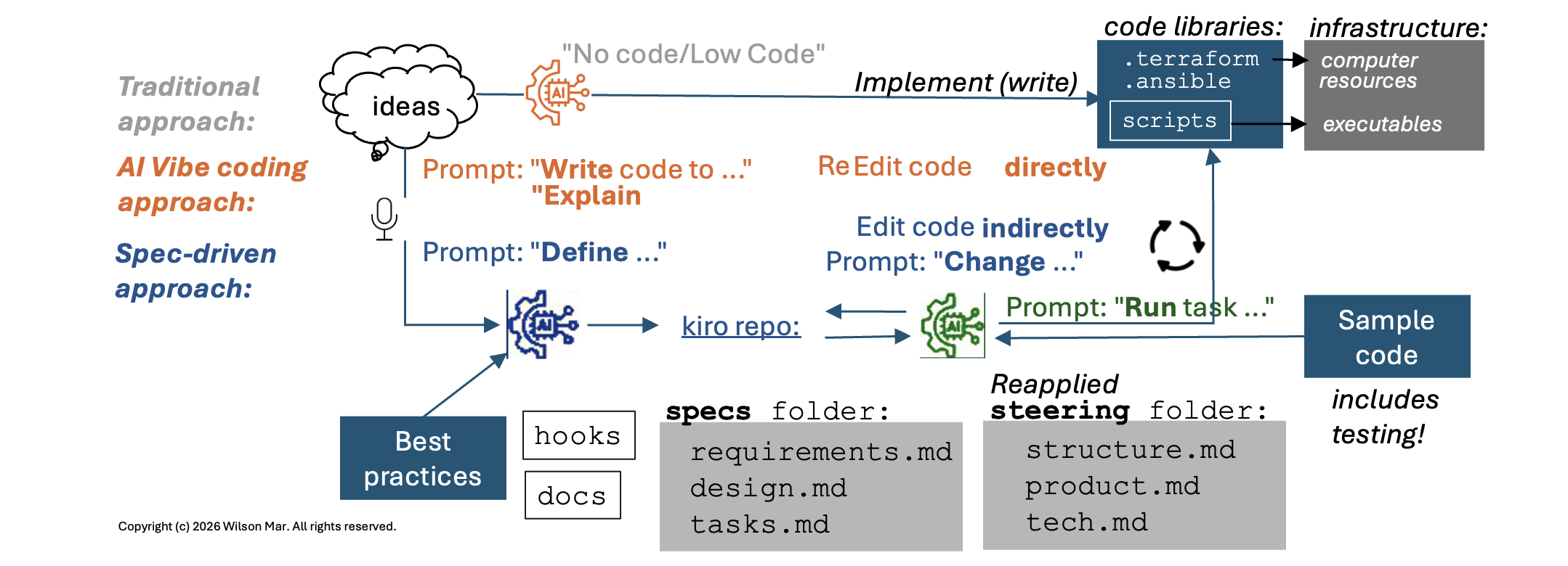 IMPORTANT: The revolution enabled by recent AI is that procedural programming code are changed indirectly by the AI. Prompts are now used to change specs which change programming code.