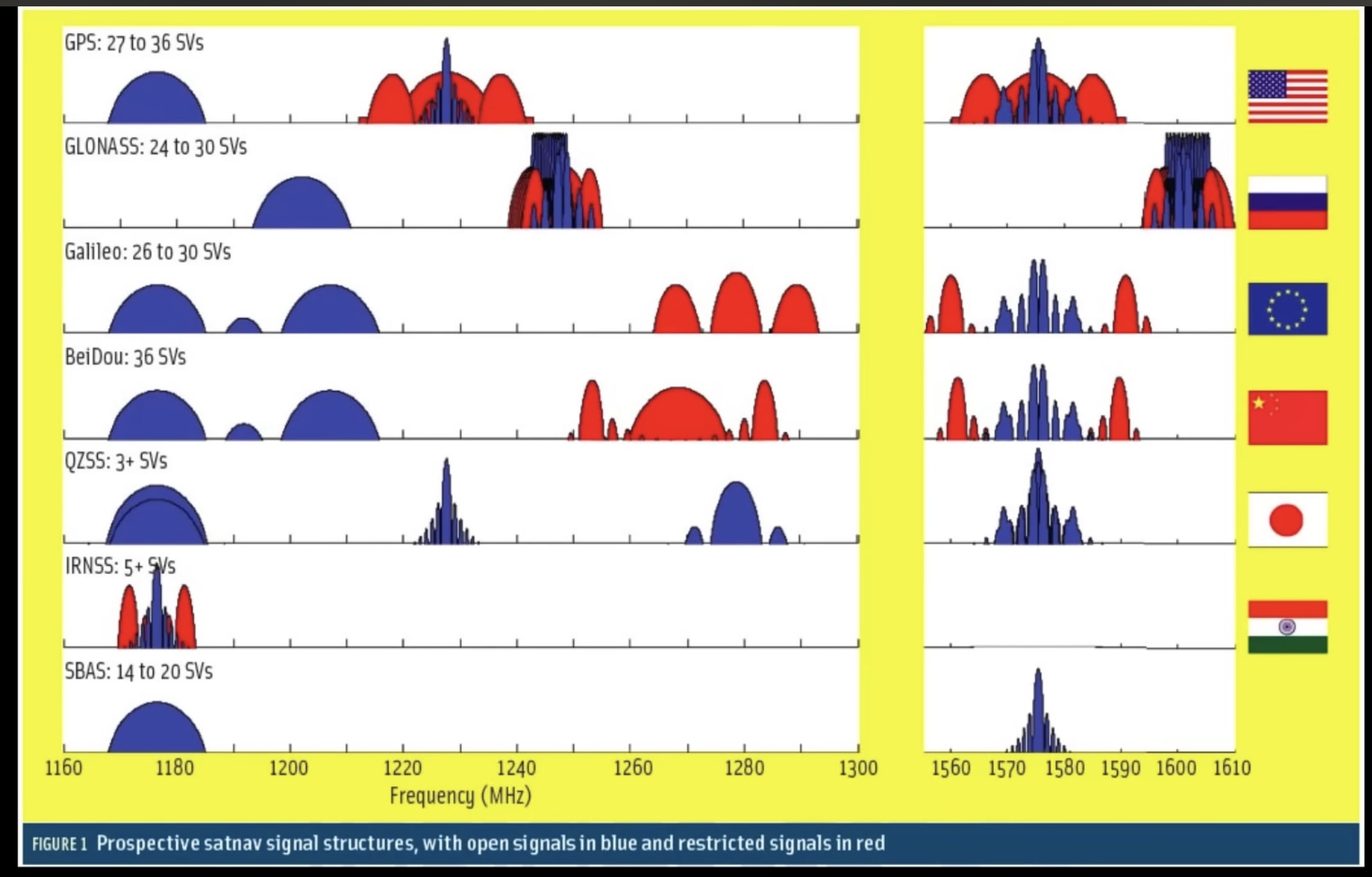 “L1” frequency was around 1575.42 MHz. Most modern satellites use “L5” frequencies at 1545.42 MHz (at right). The miliary-use “L2” frequencies at 1227.60 MHz for more accuracy. Military frequencies (shown in red above) are spread to resist VIDEO: GPS signals being jammed within conflict zones (such as the Strait of Hermuz).