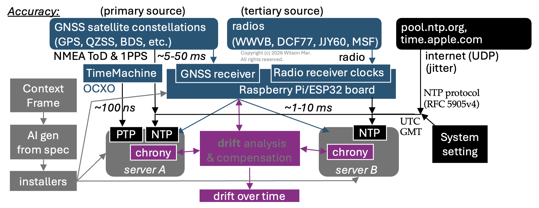 11. For accuracy of ~10–100 nanoseconds, get a “Time Machine” box that uses the PTP (Precision Time Protocol) to broadcast time syncs locally based on its onboard (OCXO oscillators) that vibrate so consistently that it maintains holdover accuracy (without internet) of 34µs after 19 hours providing a common time signal to all local servers.